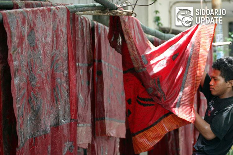 Perajin batik menyelesaikan pembuatan kain batik untuk bahan baku utama pembuatan Udeng Pacul Gowang di batik tulis Al Huda Sidoarjo.